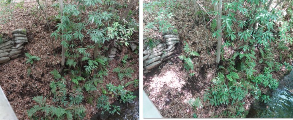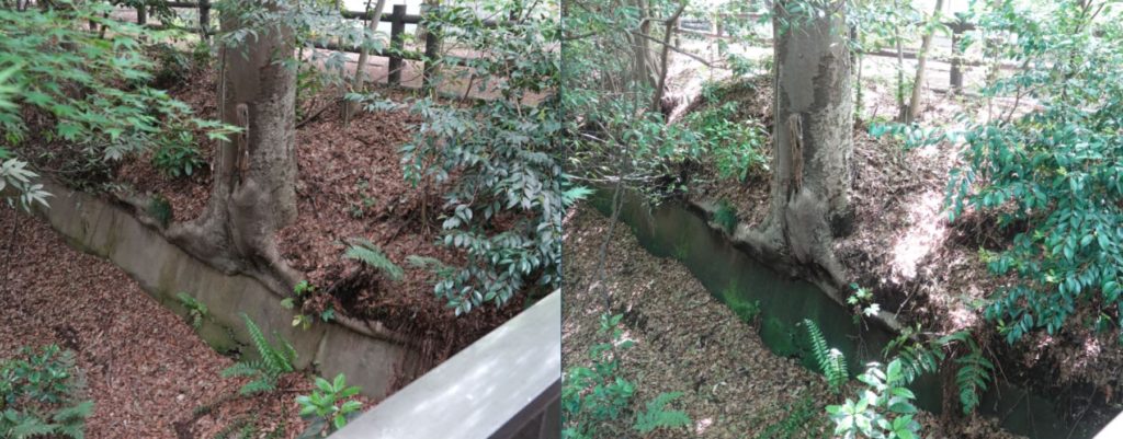 三鷹市の玉川上水沿いに40年以上住まわれている有賀ご夫妻(玉川上水の環境を守る会)の話を聞くと、通水停止から清流が復活するまでの空堀期の後半には、三鷹駅より下流には1滴も水が流れてこなくて、乾燥で上水法面はポロポロだったということです。有賀ご夫妻は空堀期のときに上水に投げ込まれるゴミを拾いあげる活動もされていました。有賀喜見子さんと話すと『1年に1センチ崩れているとしたら、40年で40センチ崩れるはず、だけどそんなに形状が変わってはいない』と聞きました。